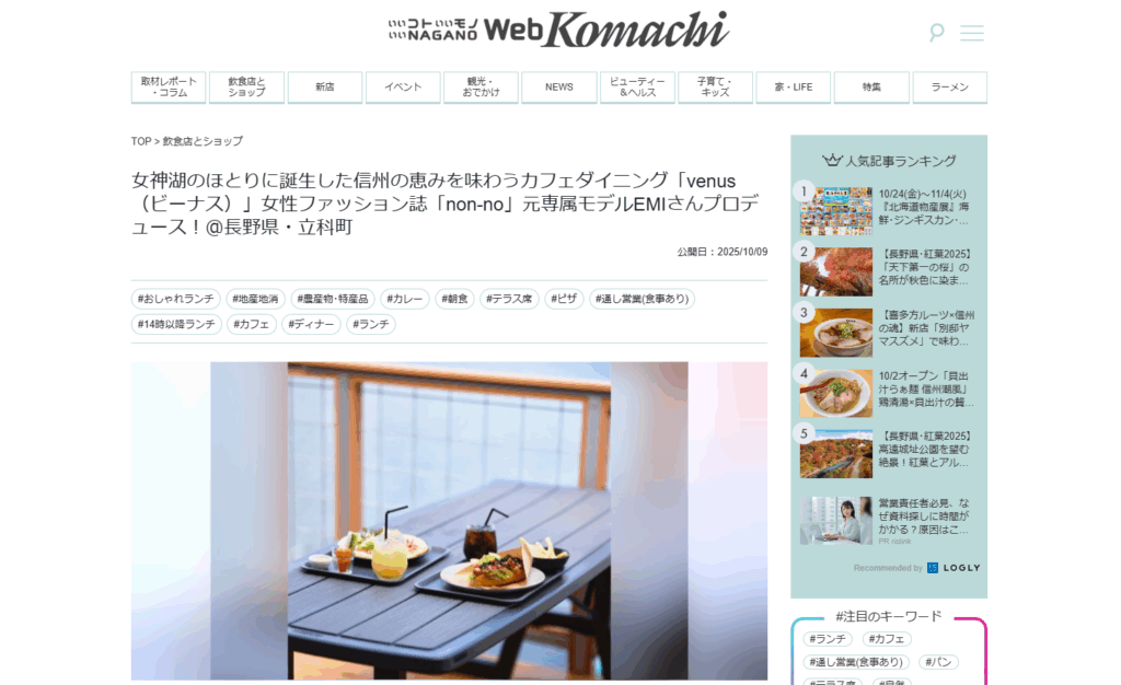 「女神湖のほとりに誕生した、信州の恵みを味わうカフェダイニング」として、当店のコンセプトや人気メニュー、こだわりの空間づくりについて詳しく取り上げていただいています。